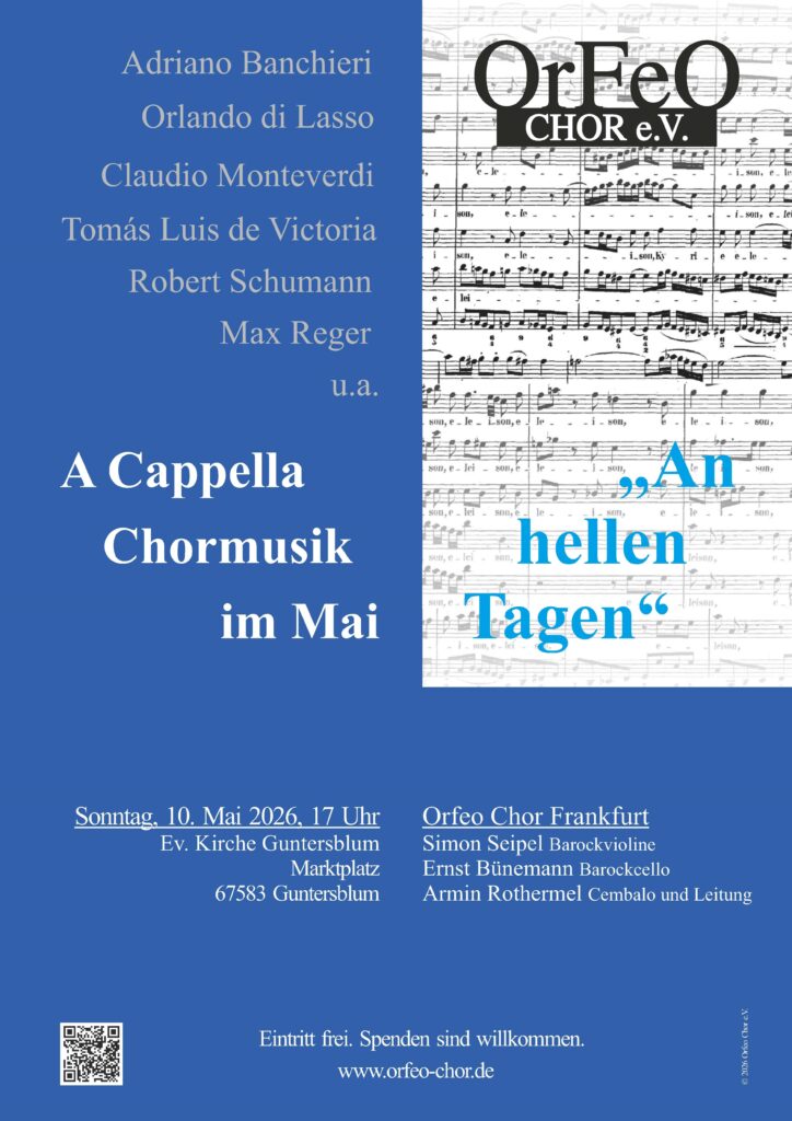 A Cappella Chormusik im Mai „AN HELLEN TAGEN“ Sonntag, 10. Mai 2026, 17 Uhr Evangelische Kirche Guntersblum Eintritt frei, Spenden sind willkommen