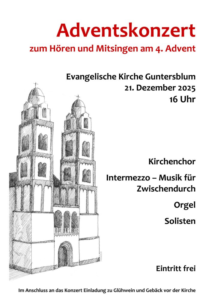 Adventskonzert 2025 Evangelische Kirche Guntersblum21.Dezember 202516. Uhr Kirchenchor Intermezzo – Musik für Zwischendurch Orgel Solisten Eintritt frei